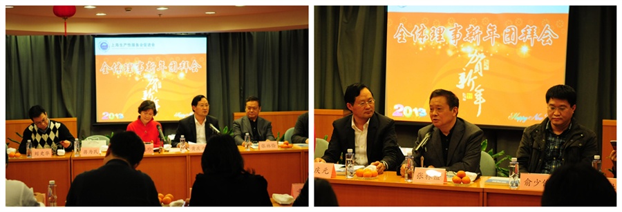 1月22日下午,上海生产性服务业促进会全体理事2013新年团拜会于东亚体育宾馆5楼会议厅顺利召开,秘书长王惠珍主持会议,常务副会长黄庆元作2012年工作总结,会长张林俭作2013年主要工作要点报告。