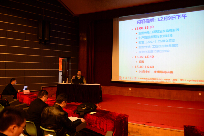 在三天的学习中,促进会秘书长王惠珍开讲培训第一课《上海生产性服务业发展现状、挑战和机遇》,报告围绕国内外生产性服务业发展基本现状、上海生产性服务业发展现状、特点和面临的挑战与机遇展开,为学员完整的呈现了上海生产性服务业发展的历程,并提出了“十三五”上海生产性服务业发展思路和展望;市经信委装备处副处长刘平为大家讲解了《上海高端制造业的现状、挑战和机遇》;交通大学教授明新国围绕《GE公司航空发动机服务案例分析》、《美国生产性服务业发展趋势/经验借鉴》、《英国/欧洲生产性服务业发展趋势/经验借鉴》、《国务院发26号文解读》、《汽车/装备/化工业服务案例分析,并剖析企业服务化发展的趋势》、《第三次工业革命与美国再工业化》、《德国工业4.0》、《民用飞机服务案例分析,并引导出工业产品服务的价值创造过程》、《陕鼓集团服务案例分析,并引导出制造业服务化转型发展路径》、《电梯服务案例分析,并引导出工业产品服务方案设计方法》、《工程机械服务案例分析,并引导出服务供应链管理技术》等内容,通过课程讲解和案例剖析,深入浅出地阐明道理,使学员们受益匪浅。